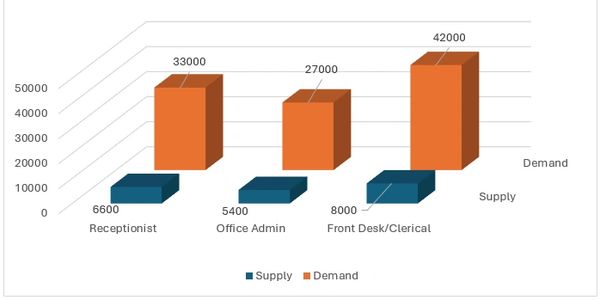 Recent data collected from Indeed 2025, BLS / ZipRecruiter 2025, and the Deloitte Gen Z Survey 2024 reveal up to an 83% demand gap for qualified front desk and admin roles — a shortage that shows no signs of reversing.
